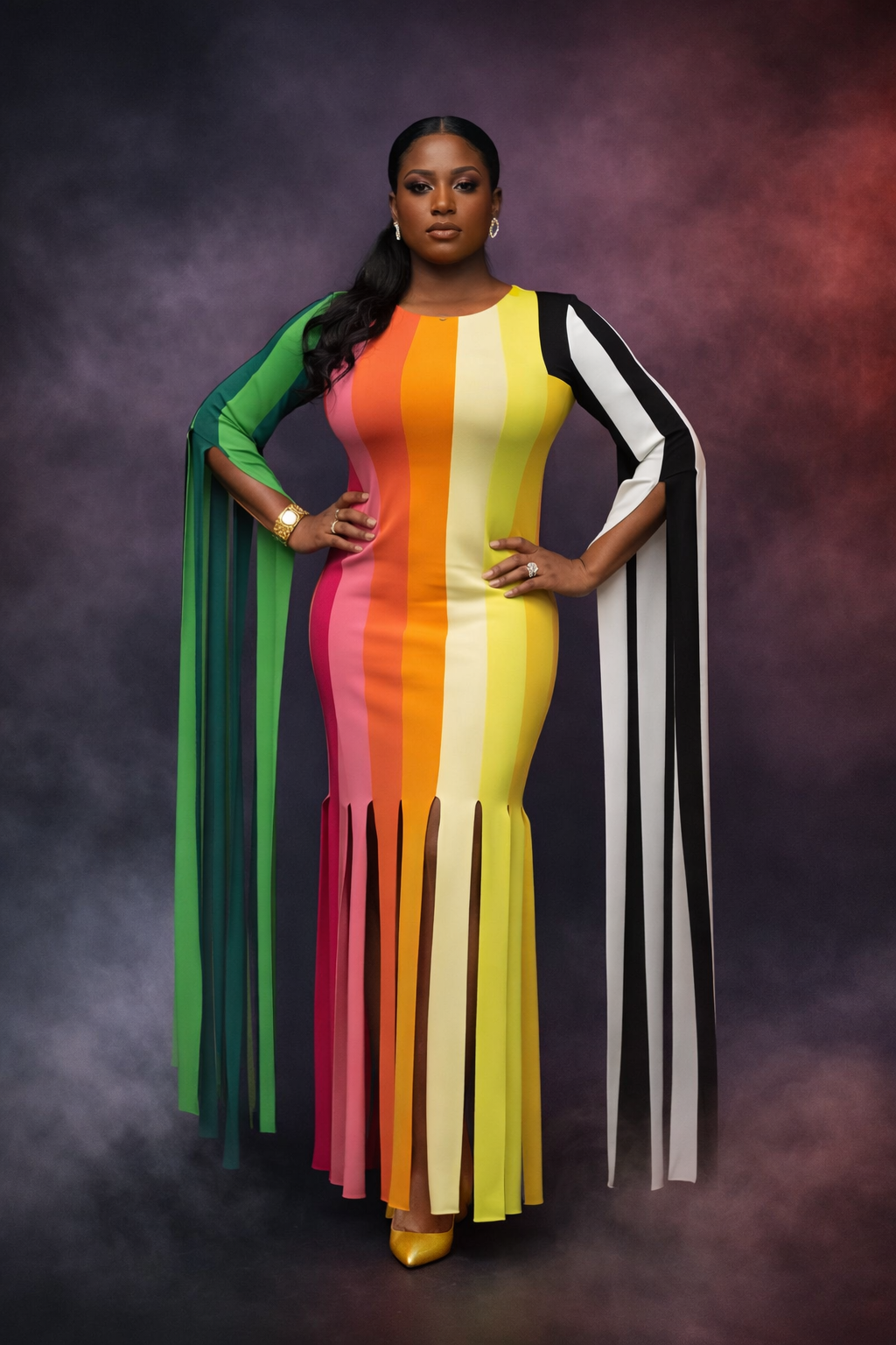 The bold vertical stripes elongate the silhouette while the flowing sleeve details create stunning movement as you walk.